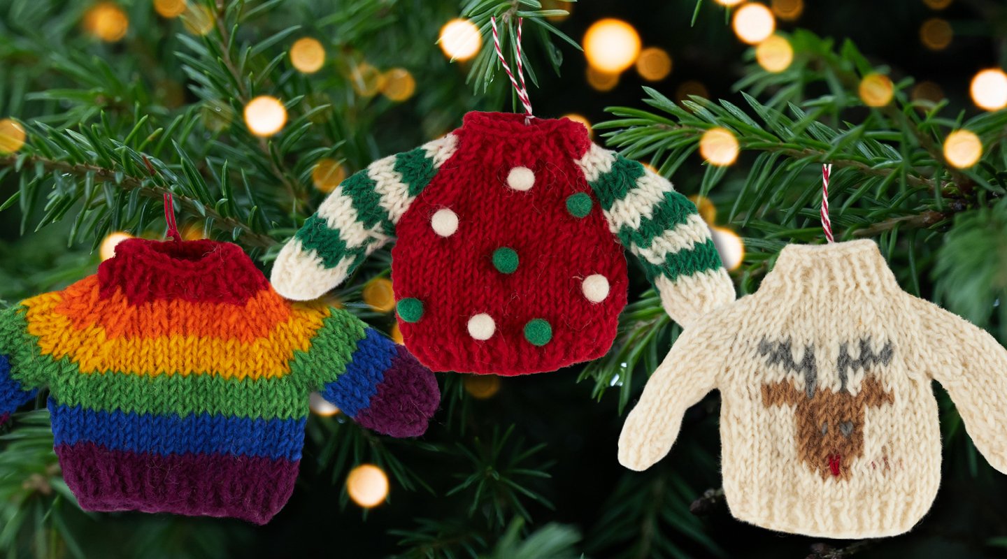 Please note: Each hand-knitted jumper tree decoration is unique, with a joyful mix of festive colours and patterns. As designs vary, we’re unable to offer a choice.