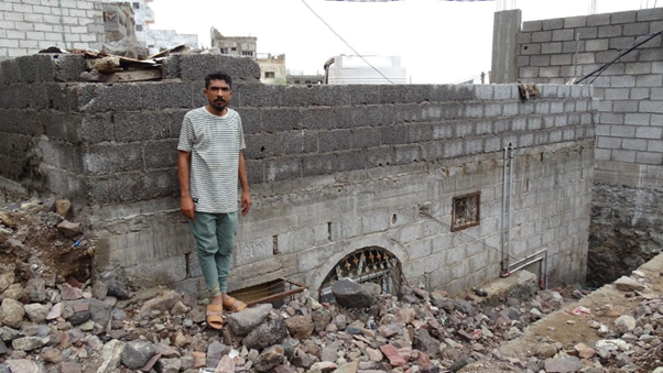 Sam standing in front of his home, AlQaluaa, Aden. Photo credit: Abdulbari Othman/August 2025